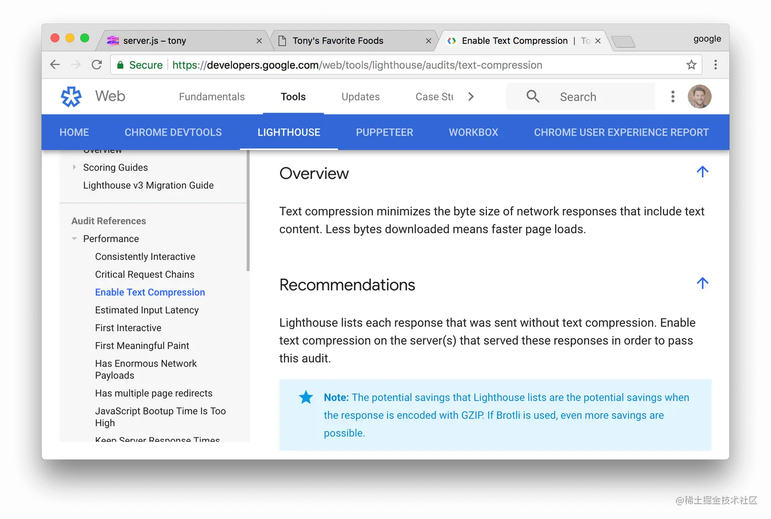 您的报告中说,启用文本压缩是提高页面性能的首要机会之一。