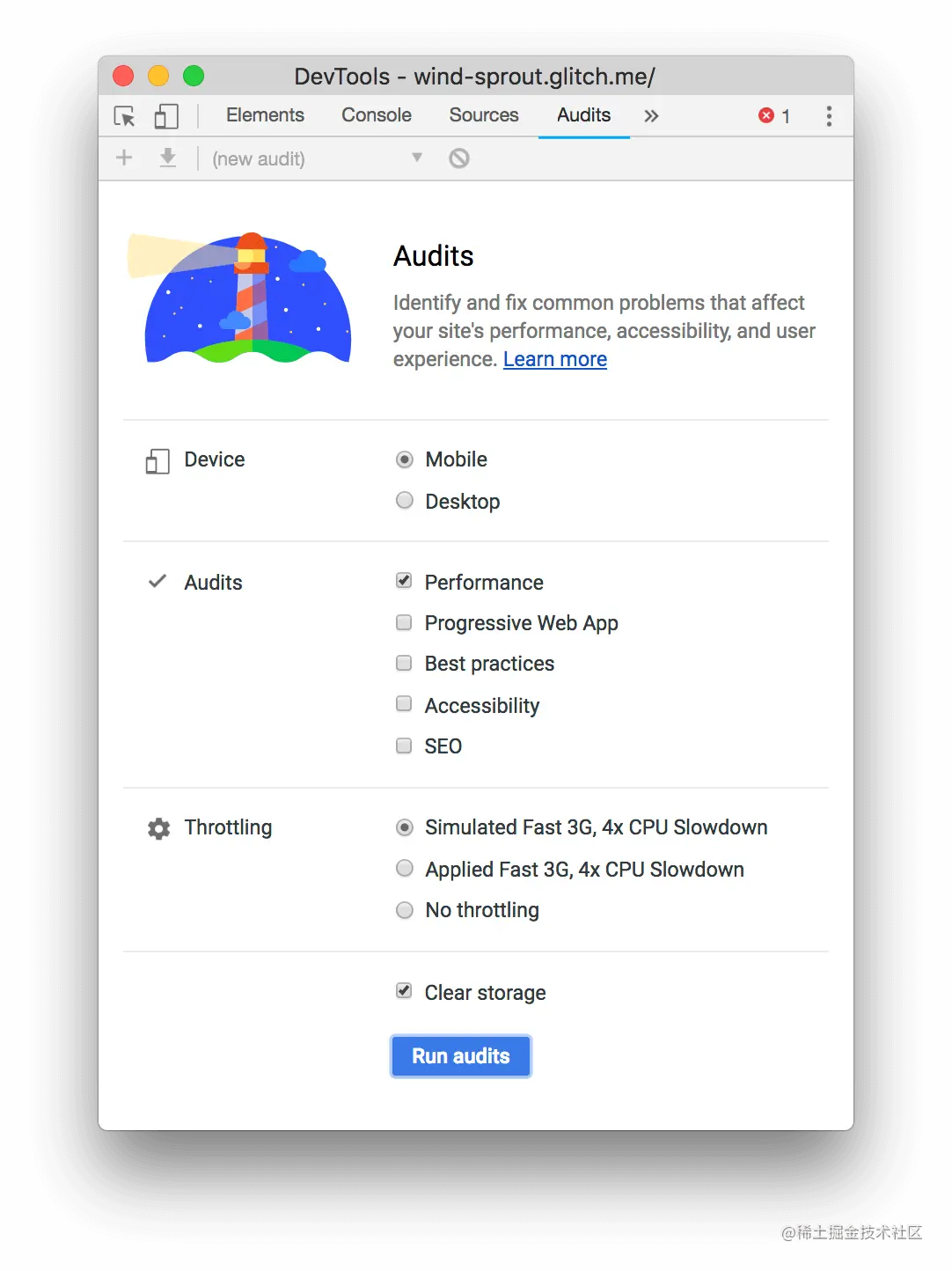 - 单击 "审计 "选项卡。它可能隐藏在更多面板更多面板按钮后面。这个面板上有一个Lighthouse,因为为Audits面板提供动力的项目叫做Lighthouse。