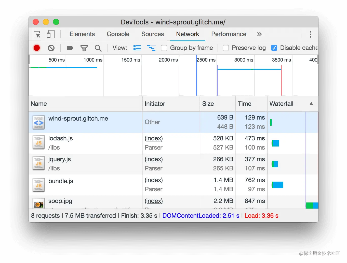 bundle.js的顶部值261 KB是通过网络发送的文件大小,底部值1.4 MB是未压缩的文件大小。
