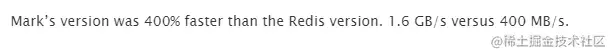 然后 mattsta 发现了 stackoverflow 有个叫 Mark 的哥们自己写了个高速版 CRC-64 实现,他将 Mark 的实现和 Redis 的实现进行了对比,发现 Mark 的版本比 Redis 版本快了400% ,分别是1.6 GB/s 和400 MB/s。