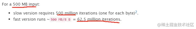 因此对于 500 MB 的输入来说 Redis 的版本需要 5 亿次循环,而新版本只要 6250 万次。