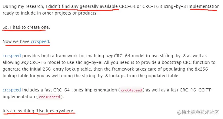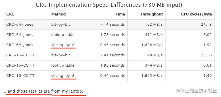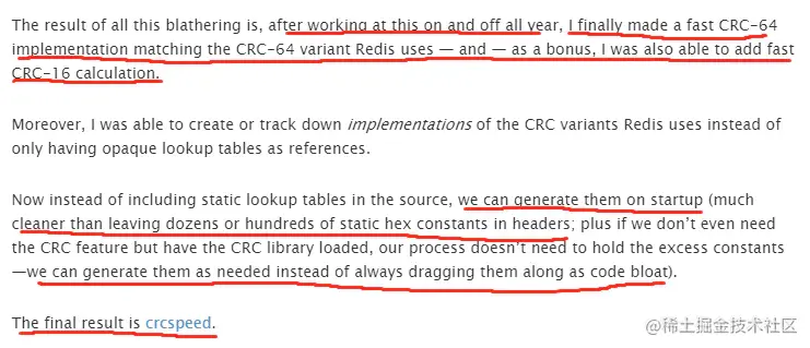 于是我就去查,看看 Redis 的作者 antirez 有没有相关的介绍,这一查就查到了一位叫 mattsta 的老哥的 14 年写的文章,这老哥的文章可太有意思了,他认为 Redis 现在实现的 CRC 算法太简陋了,他有能提升 4 倍性能的增强版 CRC 算法 - CRCSpeed,因此他写了这篇文章进行了一波分析。