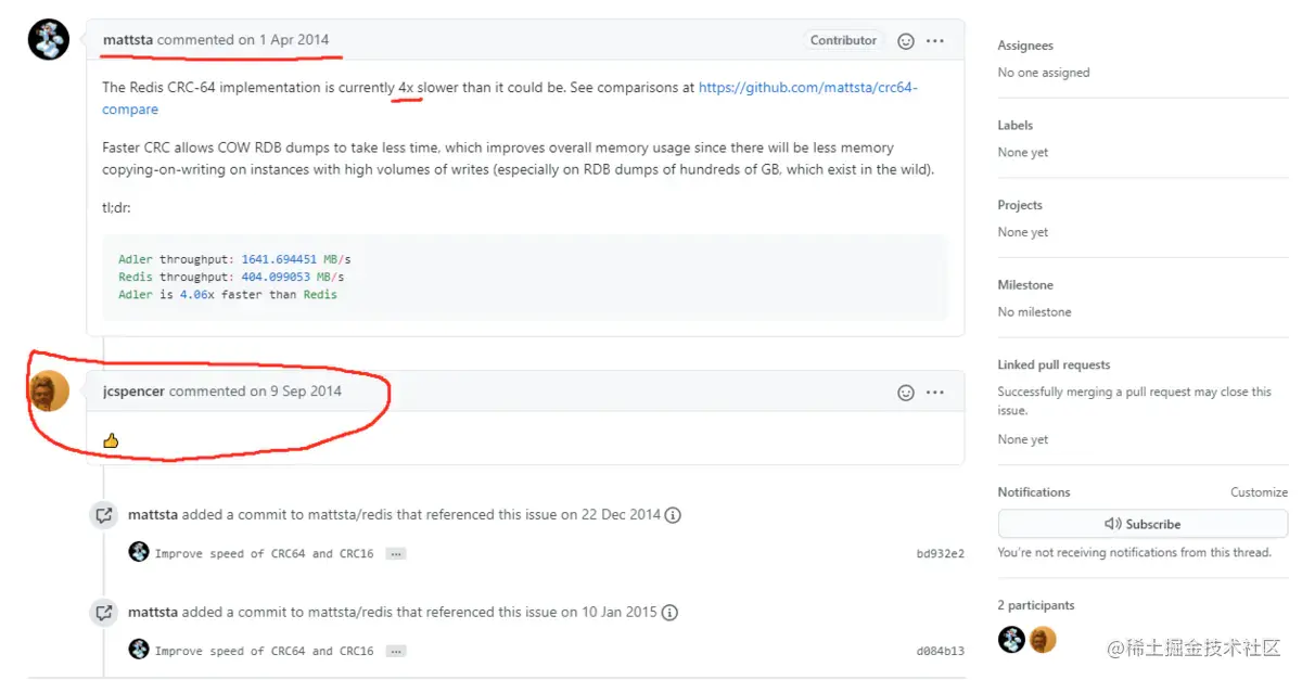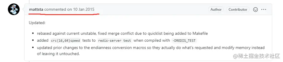 mattsta 也没有继续说啥,对 Redis 输出到2015年初之后就不再输出了。而 CRC-16 到现在还使用的是老版本,CRC-64 是 antirez 在时隔六年的2020-04-28做的修改,使用的就是 mattsta 的crcspeed。