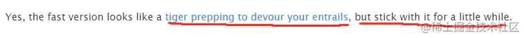mattsta 用了一个我觉得很搞笑的形容 tiger prepping to devour your entrails 。这新版本的代码看起来像一只老虎准备吃掉你的内脏!再坚持一会儿!这还是个超链接,我点过去真的是一只老虎图!