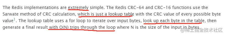 简单翻译下:这 Redis 的实现极其简单(这个 extremely 单词我很是喜欢)。就是一个简单的查表法,然后循环一个字节一个字节比过去,时间复杂度是O(N)。