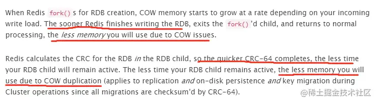 简单的翻译下就是:Redis 在生成 RDB 的时候会 fork 出子进程,因此采用的是写时复制,所以内存的增长取决于写入的负载,那么快速的结束 RDB 退出 fork 的子进程,用在 COW 的内存就会更少,而生成 RDB 的时候又用到了CRC-64 作为校验,那么 CRC-64 校验越快,RDB 生成的就越快,用于 COW 复制而使用的内存就越少。