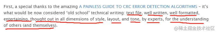 然后他列出了他所参考的一些资源,他首先感谢了「A PAINLESS GUIDE TO CRC ERROR DETECTION ALGORITHMS」这篇文章。