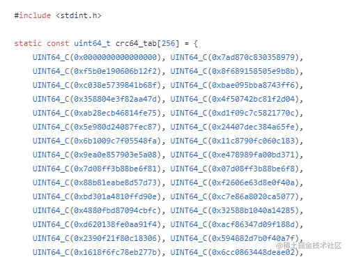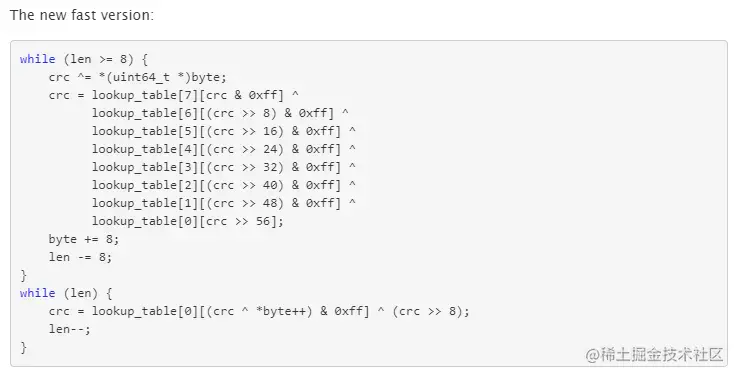 这个slicing-by-8是英特尔公司的研究人员于 2006 年发布,也就是说利用 8 个查找表,每个查找表包含另一个 256 字节的查找表来实现一次能处理 8 个字节的 CRC-64 算法。简单的说还是空间换时间的操作。