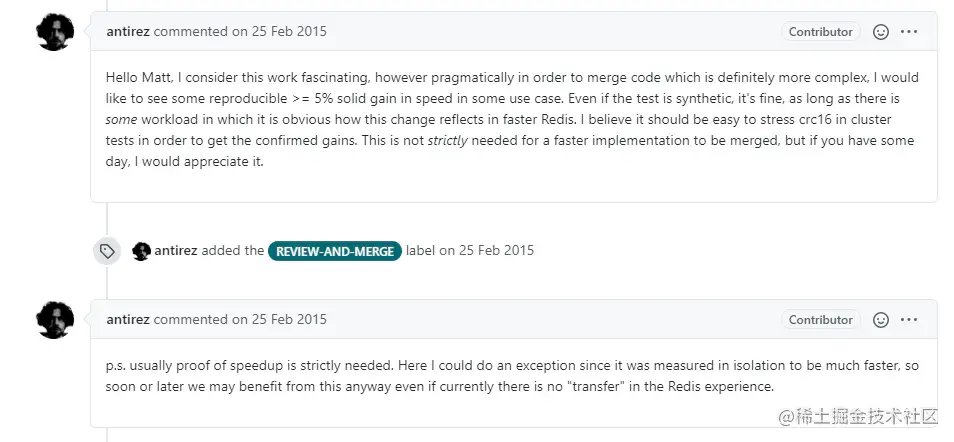 可以到 mattsta 在 2014-04-01就提了 issue,然后没有任何回应的情况下自己研究,找了许多资料,最后实现了 crcspeed,也肝出了一篇文章,之后在同一天提了PR,然后过了近两个月的时间得到 antirez 的回复,由其没有关于 Redis 的实质上的测试,因此不给合并,但被给予肯定。