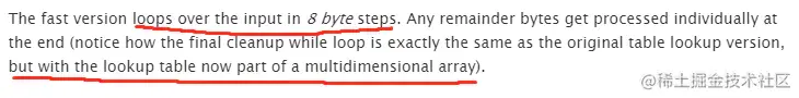 然后他说强调了下算法的快的原因,就是利用多维数组查表,每次循环可以处理8个字节。