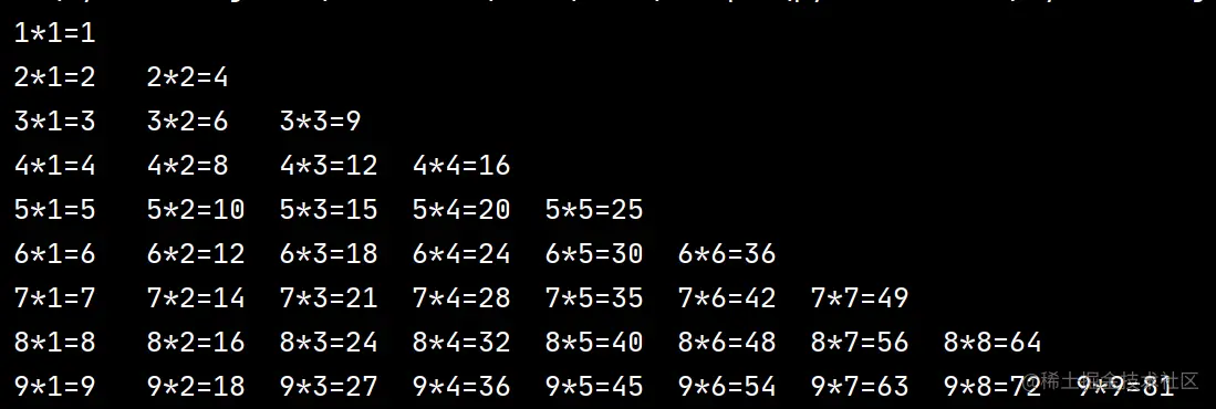 使用了双重for循环,当经历第一重for循环对应行数和一到九的数字和换行,第二重for循环对应乘法表里面的每一层的第二个因数。
