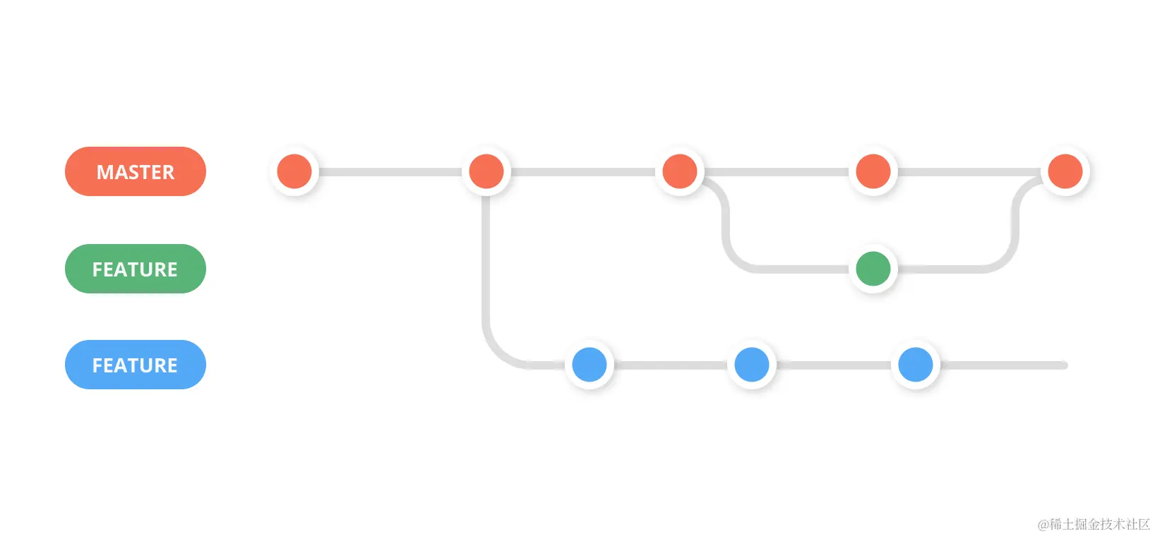 一旦将此分支与 master 分支合并并部署到生产环境后,它也将被合并回 develop 分支中,以便之后从 develop 分支创建新功能分支时,新的分支能够具有最新代码。
