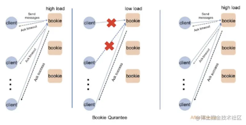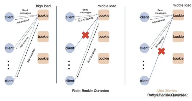 这一 quarantine 策略可以避免所有 bookie client 同时将同一台 bookie 关入小黑屋,避免 bookie 入流量抖动。相关 PR 请参见:BookKeeper PR-2327 ,由于代码没有合并和发布到 bookie 主版本,大家如果想使用该功能,需要自己独立编译代码:github.com/apache/book…