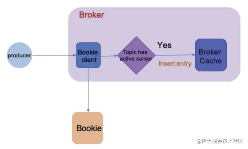 当 broker 收到 producer 发送给某个 topic 的消息时,首先会判断该 topic 是否有 Active Cursor,如果有,则将收到的消息写入该 topic 对应的 Cache 中;否则,不写入 Cache。处理流程如下图所示: