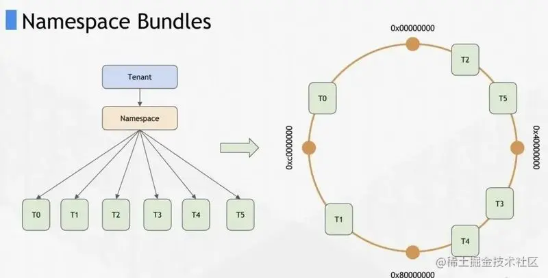 Namespace Bundle 结构如下,每个 namespace(命名空间)由一定数量的 bundle 组成,该 namespace 下的所有 topic 均通过 hash 方式映射到唯一 bundle 上,然后 bundle 通过 load/unload 方式加载/卸载到提供服务的 broker 上。