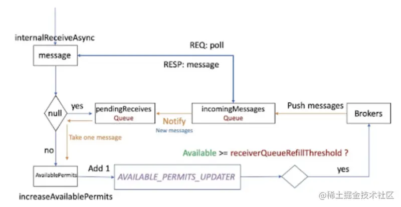 当 consumer 调用 receive 接口消费一条消息时,它会直接从本地的 receiverQueue 中请求一条消息,如果 receiverQueue 中还有消息可以获取,则直接将消息返回给 consumer 端,并更新 availablePermit,当 availablePermit < receiverQueueSize/2 时,Pulsar client 会将 availablePermit 发送给 broker,告诉 broker 需要 push 多少条消息过来;如果 receiverQueue 中没有消息可以获取,则等待/返回失败,直到 receiverQueue 收到 broker 推送的消息才将 consumer 唤醒。