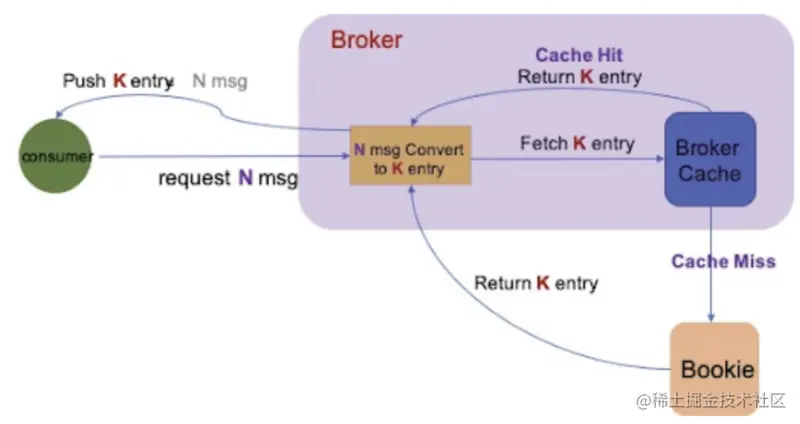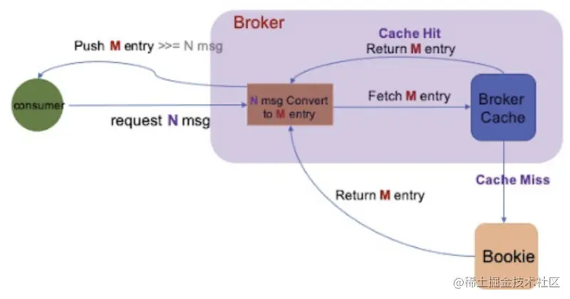 Broker 收到 availablePermit 之后,会从 broker Cache/bookie 中读取 max(availablePermit, batchSize) 条 entry,并发送给 consumer 端。处理逻辑如下图所示: