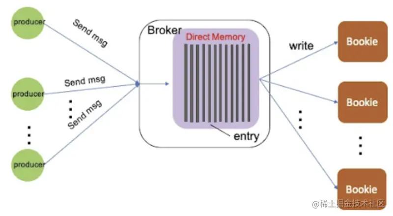 当 broker 接收到 producer 发送的 message 时,首先会将消息存放在 broker 的 direct memory 中,然后调用 bookie client 根据配置的(EnsembleSize,WriteQuorum,AckQuorum)策略将 message 以 pipeline 方式发送给 bookies。