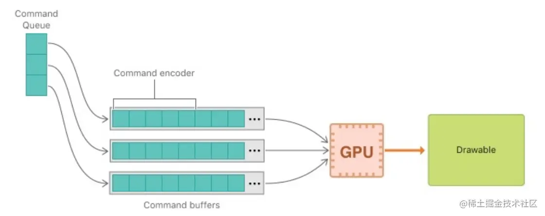 想要通过Metal创建和提交命令给GPU进行处理,就必须按照Metal规则进行命令对象的处理。如图所示: