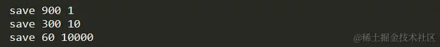 - **第一条的意思是:**服务器在900秒内对数据库执行过至少1次修改,就会执行BGSAVE命令