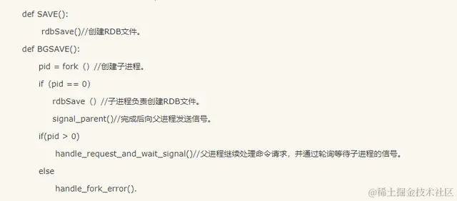 SAVE命令和BGSAVE命令的底层调用的函数都是同一个函数rdbSave,只不过SAVE命令是直接调用这个函数,而BGSAVE会fork()出子进程来调用这个函数。伪代码如下: