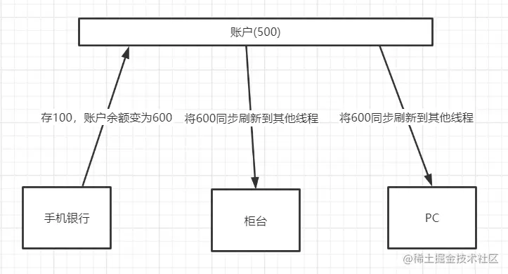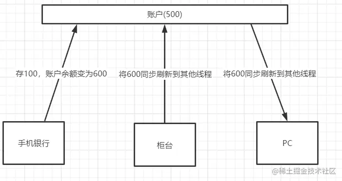 这样想着是不是马上可以去银行搞一波事情? 哈哈,你想太多了,如果能这样搞,银行早破产了。我们主要是来分析一下出现这个问题的原因,JVM内存是JMM结构的,每个线程操作的数据是从主内存中复制的一个和备份,而多个线程就会存在多个备份,当线程中的备份数据被修改时,会将值刷新到主内存,比如多个线程同时获取到了账户的余额为500元,A线程存钱100,线程A将600刷新到主内存,,所以主内存的值此时与其他线程的值是不同的,如果其他线程再操作账户余额,是在500的基础上进行的,这显然不是我们想要的结果。