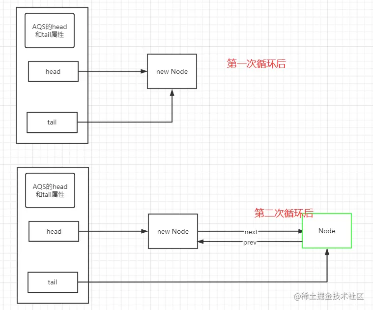 - 第二次循环,将当前线程封装的Node对象设置为尾结点,并将前一个尾结点的next指向此Node