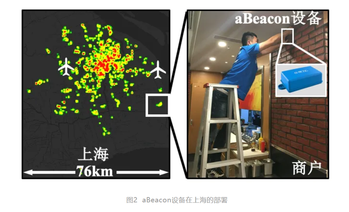 (2) aBeacon系统的局限之一就是我们还需要部署和维护硬件设备,在后来的工作中,我们仍在探索采用已有的终端设备作为虚拟的aBeacon设备用以辅助骑手的定位。基于此,我们正在开展aBeacon+系统的研究工作,解决一些相关的问题,比如终端设备自身定位,以及隐私保护等。