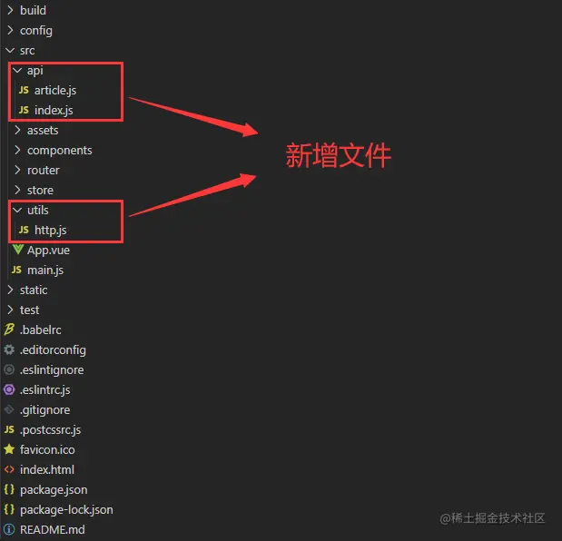 这里把api也统一存放管理了,首先要在src中创建文件utils --> http.js(封装axios使用) 和 api --> index.js(api总站指挥中心) & article.js(api个体集) 下边是图片演示,了解后我们就可以开始安装使用axios了