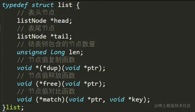 为了更加方便的操作,使用list结构体来持有链表。list结构为链表提供了表头指针head、表尾指针tail,以及链表节点数量len,dup、free、match成员则是为了实现链表功能而提供的接口。