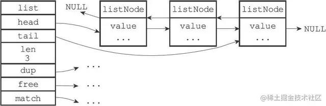 - match函数用于对比链表节点所保存的值和另一个输入值是否相等由list结构和listNode组成的链表如下图所示,这就是Redis中list类型的实现。
