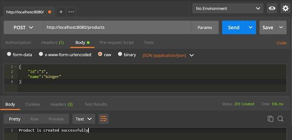 package com.tutorialspoint.demo.controller;import java.util.HashMap;import java.util.Map;import org.springframework.http.HttpStatus;import org.springframework.http.ResponseEntity;import org.springframework.web.bind.annotation.RequestBody;import org.springframework.web.bind.annotation.RequestMapping;import org.springframework.web.bind.annotation.RequestMethod;import org.springframework.web.bind.annotation.RestController;import com.tutorialspoint.demo.model.Product;@RestControllerpublic class ProductServiceController { private static Map<String, Product> productRepo = new HashMap<>(); @RequestMapping(value = "/products", method = RequestMethod.POST) public ResponseEntity<Object> createProduct(@RequestBody Product product) { productRepo.put(product.getId(), product); return new ResponseEntity<>("Product is created successfully", HttpStatus.CREATED); }}