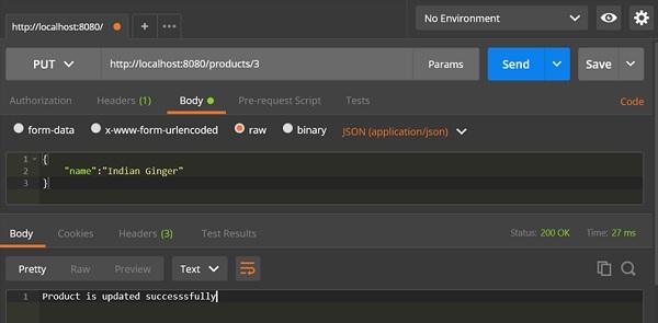 package com.tutorialspoint.demo.controller;import java.util.HashMap;import java.util.Map;import org.springframework.http.HttpStatus;import org.springframework.http.ResponseEntity;import org.springframework.web.bind.annotation.PathVariable;import org.springframework.web.bind.annotation.RequestBody;import org.springframework.web.bind.annotation.RequestMapping;import org.springframework.web.bind.annotation.RequestMethod;import org.springframework.web.bind.annotation.RestController;import com.tutorialspoint.demo.model.Product;@RestControllerpublic class ProductServiceController { private static Map<String, Product> productRepo = new HashMap<>(); @RequestMapping(value = "/products/{id}", method = RequestMethod.PUT) public ResponseEntity<Object> updateProduct(@PathVariable("id") String id, @RequestBody Product product) { productRepo.remove(id); product.setId(id); productRepo.put(id, product); return new ResponseEntity<>("Product is updated successsfully", HttpStatus.OK); } }
