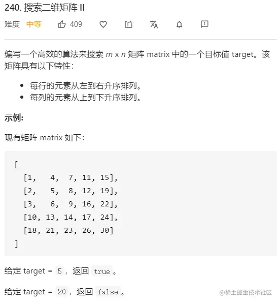 我们可以用给定的性质进行优化,因为每行的元素从左到右升序排列,每列的元素从上到下升序排列。 所以我们可以从右上角的元素开始搜索(因为右上角的元素是这一行最大的,这一列最小的),每次把右上角的元素与target进行比较, 如果相等,很好,我们找到了target,返回true;