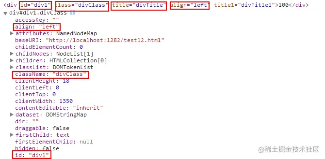<div id="div1" class="divClass" title="divTitle" align="left" title1="divTitle1"></div>