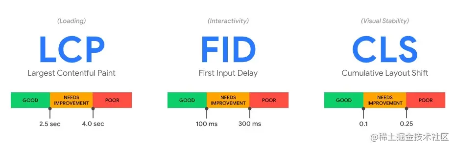 - 最大内容画(LCP):衡量加载性能。为了提供良好的用户体验,LCP应该在页面首次开始加载后的2.5秒内出现。