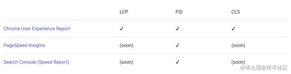 为了帮助开发者衡量和报告这些核心Web Vitals,Google致力于在其工具中浮现这些指标。下图详细介绍了哪些工具支持核心网络要素。