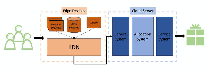 图-3是我们整体的系统架构,每一个用户在详情页回退到landing page的时候会触发决策模型,IIDN首先根据端上采集到的行为数据识别出用户的下单和停留意图,随后该意图会被推送到服务端参与最终的红包决策。我们这套系统在日常线上持续生效,同时还参与了0331商人节,助力买家数的提升。