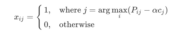 为了求解以上问题,我们采用[7]提到的primal-dual框架。定义alpha和beta_j分别是相关的对偶变量,据此框架我们可以在线求解以上问题。具体来讲,x_{ij}可以根据以下公式求得: