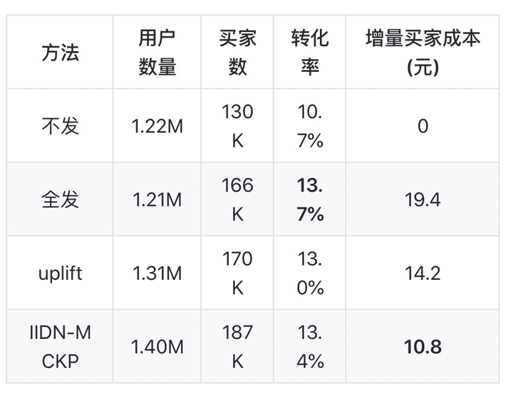 可以看到尽管全发桶带来的转化率提升最明显,但是它也带来了最大的增量买家成本。我们提出的方案不仅相对自然转化率提升了25.7%,同时也比全发桶的增量买家成本减少了44.3%,这证明了我们方案的优越性。