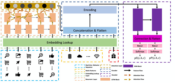 尽管在我们这一任务当中,我们只需要预测停留意图和下单意图,但是在之后扩展的场景中,更多意图也可以被识别:比如用户去往搜索的意图,用户去往新人专区的意图等。所有意图其实都像下单意图和停留意图一样存在一个逻辑上的先后关系(至少所有意图的产生都依赖于用户不离开),这样的关系使得我们想到了机器翻译当中语句生成:后一个单词的生成依赖于前一个单词的预测,这启发了我们在encoder-decoder的基础上采用seq2seq的思想:decoder会先生成S,并在此之上生成P。这样做有两个好处: