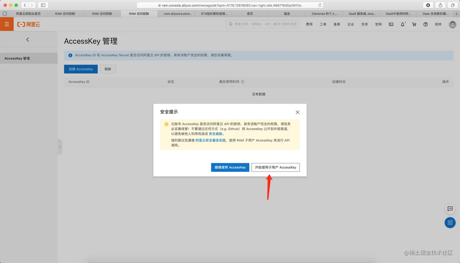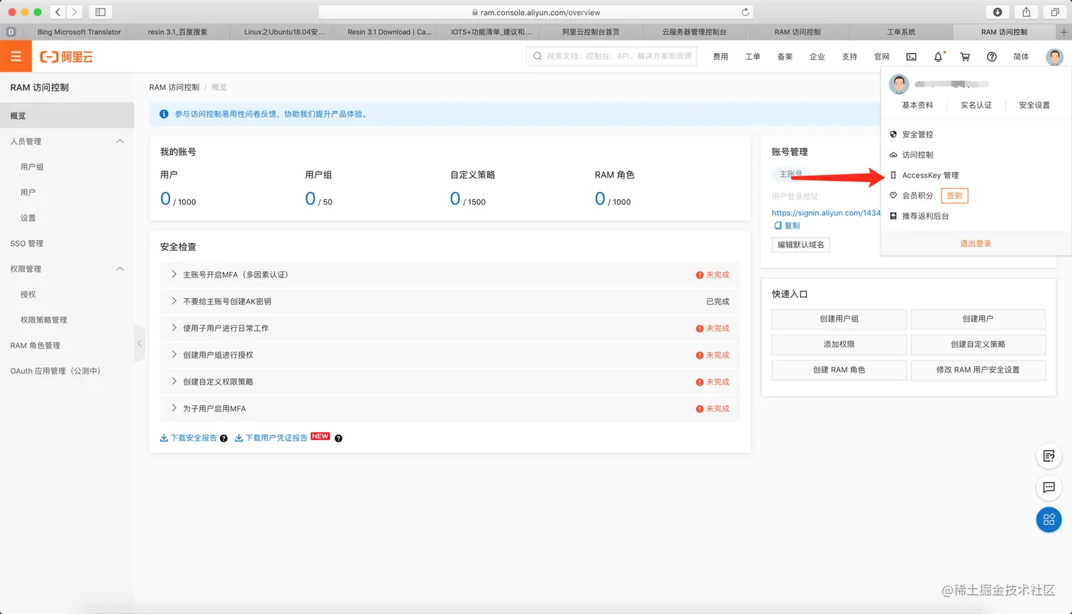 首先登陆你的阿里云账号。 在这里打开access管理界面: