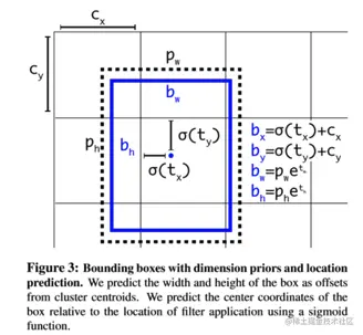 这个公式没有任何限制,使得无论在什么位置进行预测,任何anchor boxes可以在图像中任意一点结束(也就是tx 没有数值限定,可能会出现anchor检测很远的目标box的情况,效率比较低,正确做法应该是每一个anchor只负责检测周围正负一个单位以内的目标box),作者就没有采用预测直接的offset的方法,而使用了预测相对于grid cell的坐标位置的办法,把ground truth限制在了0到1之间,利用logistic回归函数来进行这一限制。