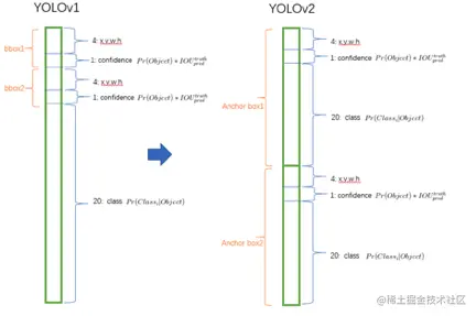 (3)不用全连接,改用anchor boxes:yolov1的全连接直接reshape会丢失空间信息,所以借鉴了Faster R-CNN中的anchor思想:直接在卷积特征图上滑动窗口采样,每个中心预测9种不同大小和比例的建议框,由于都是卷积不需要reshape,很好的保留的空间信息,最终特征图的每个特征点和原图的每个cell一一对应;且预测偏移量代替直接预测坐标。
