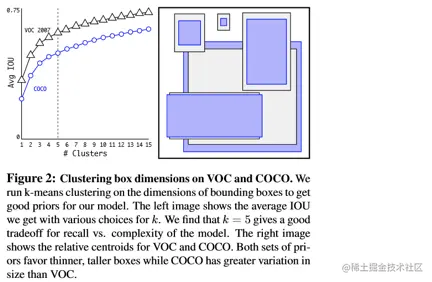 上面左图: 随着k的增大,IOU也在增大(高召回率),但是复杂度也在增加。所以平衡复杂度和IOU之后,最终得到k值为5。上面右图:5聚类的中心与手动精选的boxes是完全不同的,扁长的框较少瘦高的框较多。