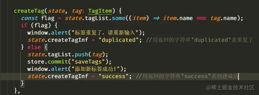 然后再在外部引用createTag方法.现在终于知道VueX的好处了.这样写的代码很美.