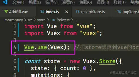 要在store.index.ts里写Vue use(Vuex),然后在main.ts里的new Vue里要写上store,表示可以用store.