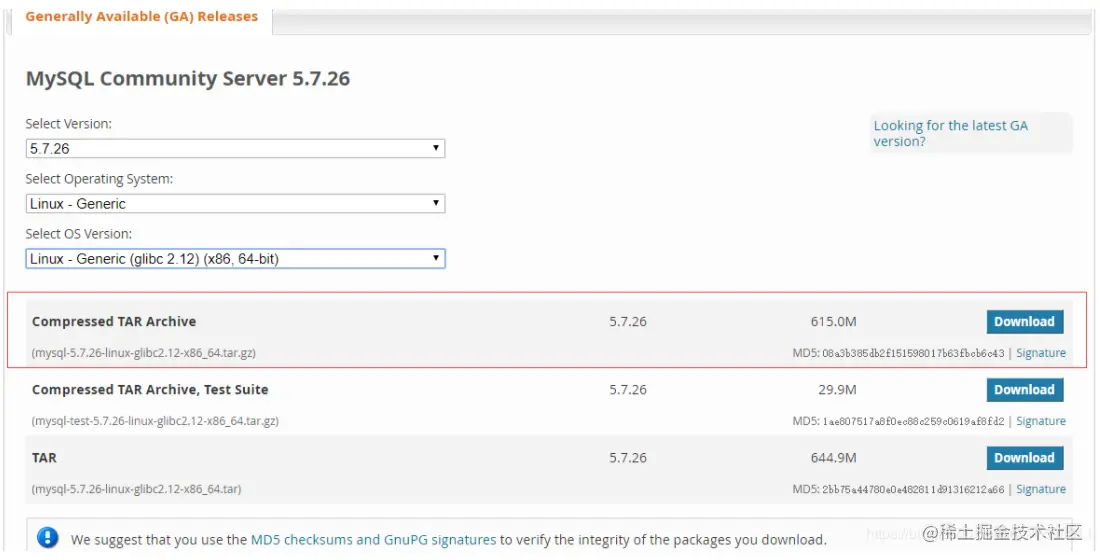 选择自己需要的版本号、linux-Geneic、linux版本,下面选择 mysql-5.7.31-linux-glibc2.12-x86_64.tar.gz文件进行下载,点击下载后面会让你登录oracle账号(可以不登录)直接下载。下面就是漫长的等待过程。