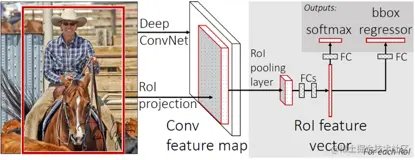 首先还是采用selective search提取2000个候选框,然后,使用一个神经网络对全图进行特征提取。接着,使用一个RoI Pooling Layer在全图特征上摘取每一个RoI对应的特征,再通过全连接层(FC Layer)进行分类与包围框的修正。
