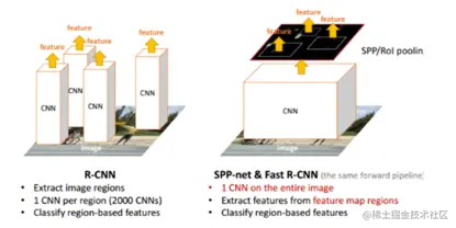 2000个待检测区域(selective search,里面也是SVM)+串行过cnn+(svm分类& bbox reg位置),训练时的pipeline是分开的。